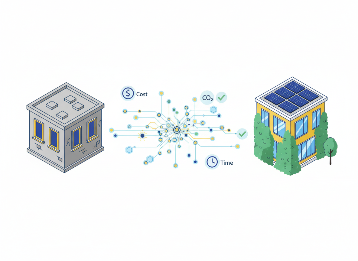 Acting as a smart advisor, the AI automatically generates and evaluates thousands of potential renovation scenarios. It identifies the “optimal” roadmap for each building, recommending the best combination of technologies (e.g., specific insulation thickness, PV sizing, heat pump capacity) to reach net-zero targets while respecting budget constraints. It transforms raw data into actionable, optimized strategies for decision-makers.